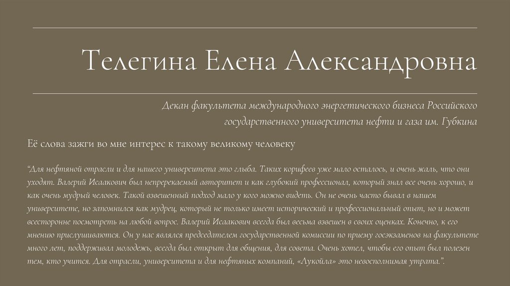 тем, кто учится. Для отрасли, университета и для нефтяных компаний, «Лукойла» это невосполнимая утрата.”.