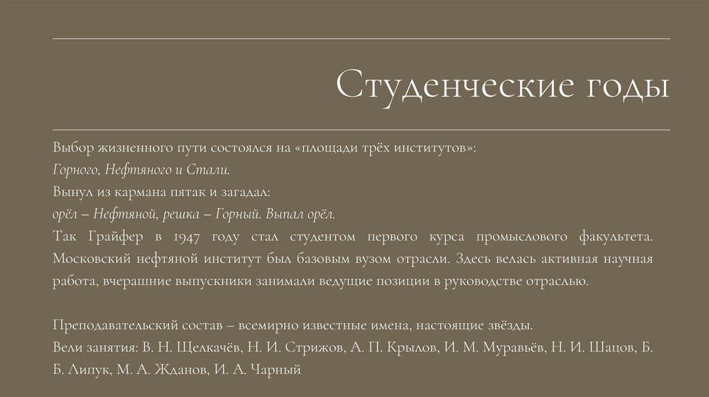 Так Грайфер в 1947 году стал студентом первого курса промыслового факультета.