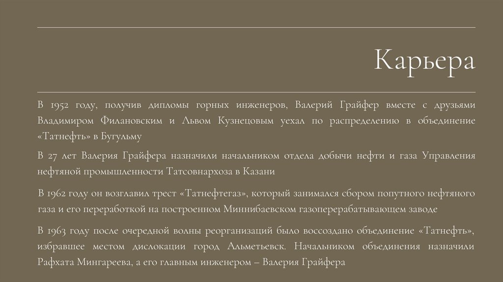 КарьераВ 1952 году, получив дипломы горных инженеров, Валерий Грайфер вместе с друзьями