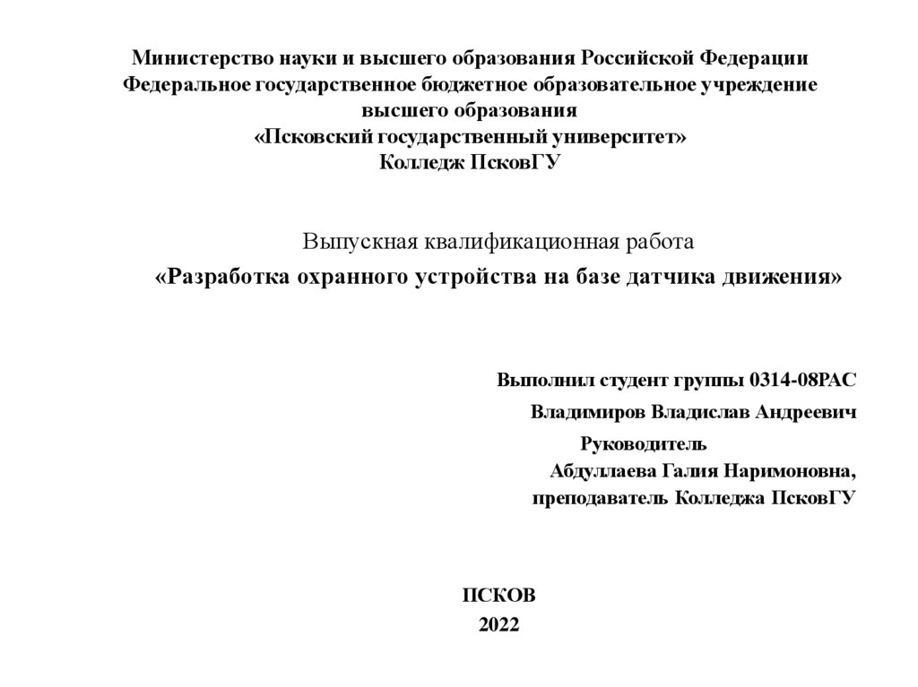 Целью выпускной квалификационной работы являются разработкадомашней охранной системы на базе датчика движения.