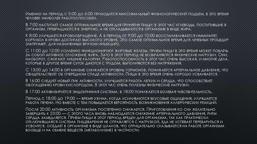 ИМЕННО НА ПЕРИОД С 5:00 ДО 6:00 ПРИХОДИТСЯ МАКСИМАЛЬНЫЙ ФИЗИОЛОГИЧЕСКИЙ ПОДЪЕМ, В ЭТО ВРЕМЯЧЕЛОВЕК НАИБОЛЕЕ РАБОТОСПОСОБЕН.