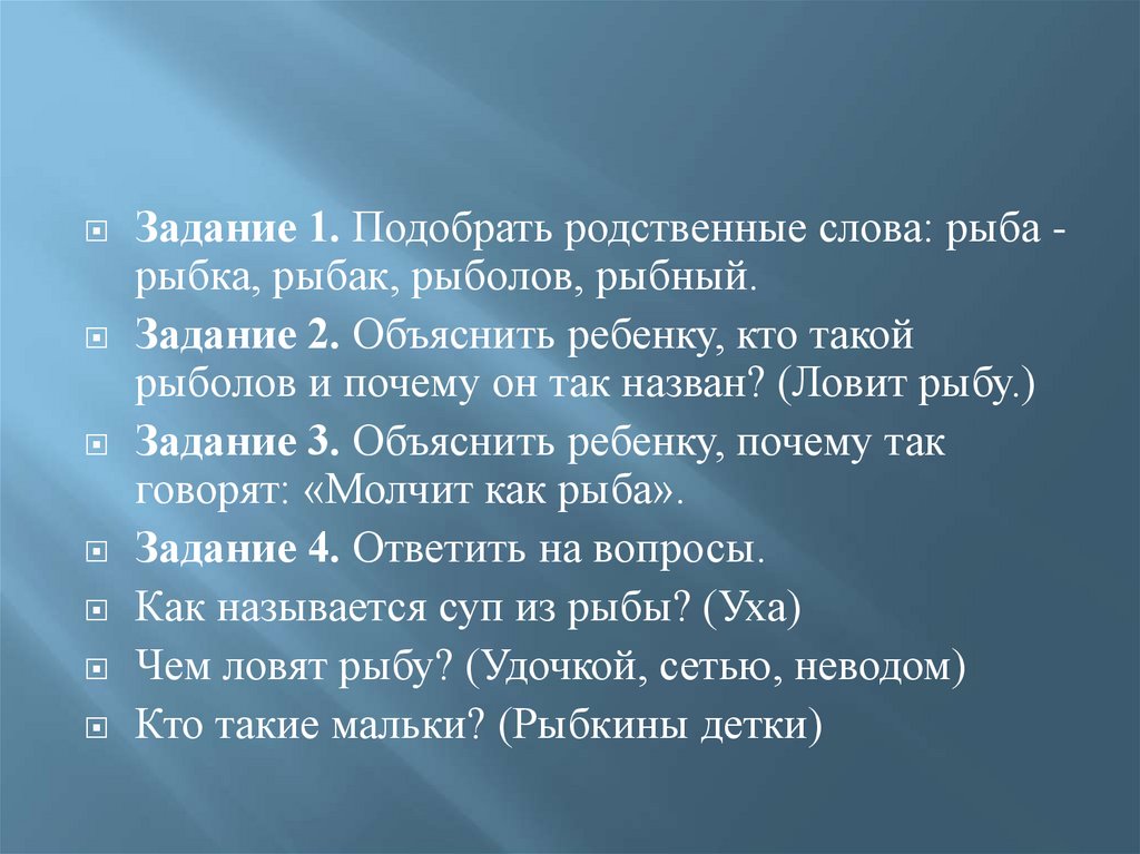 Задание 1. Подобрать родственные слова: рыба рыбка, рыбак, рыболов, рыбный.Задание 2. Объяснить ребенку, кто такой
