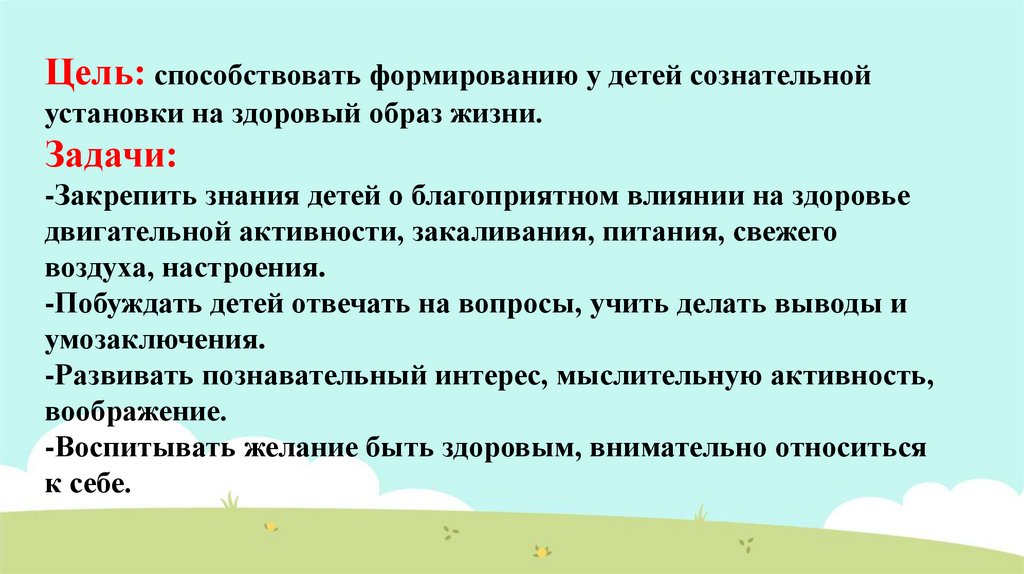 Цель: способствовать формированию у детей сознательнойустановки на здоровый образ жизни.