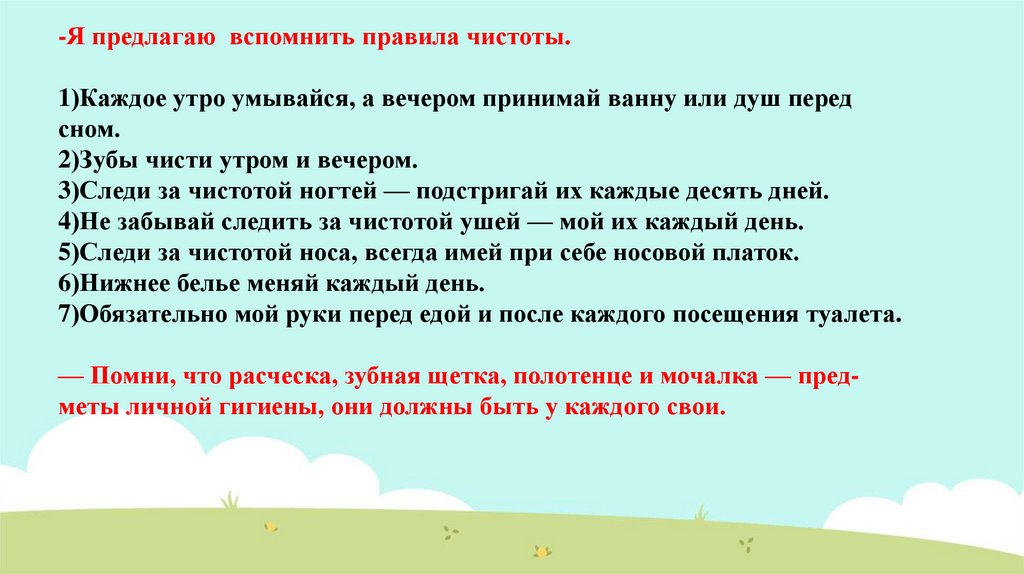 -Я предлагаю вспомнить правила чистоты.1)Каждое утро умывайся, а вечером принимай ванну или душ перед