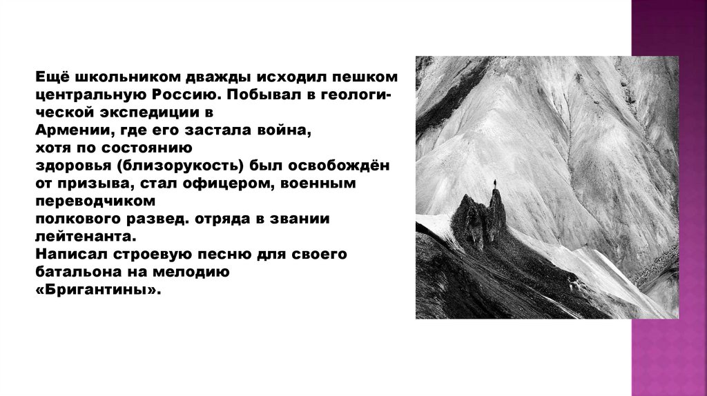 Ещё школьником дважды исходил пешкомцентральную Россию. Побывал в геологической экспедиции в