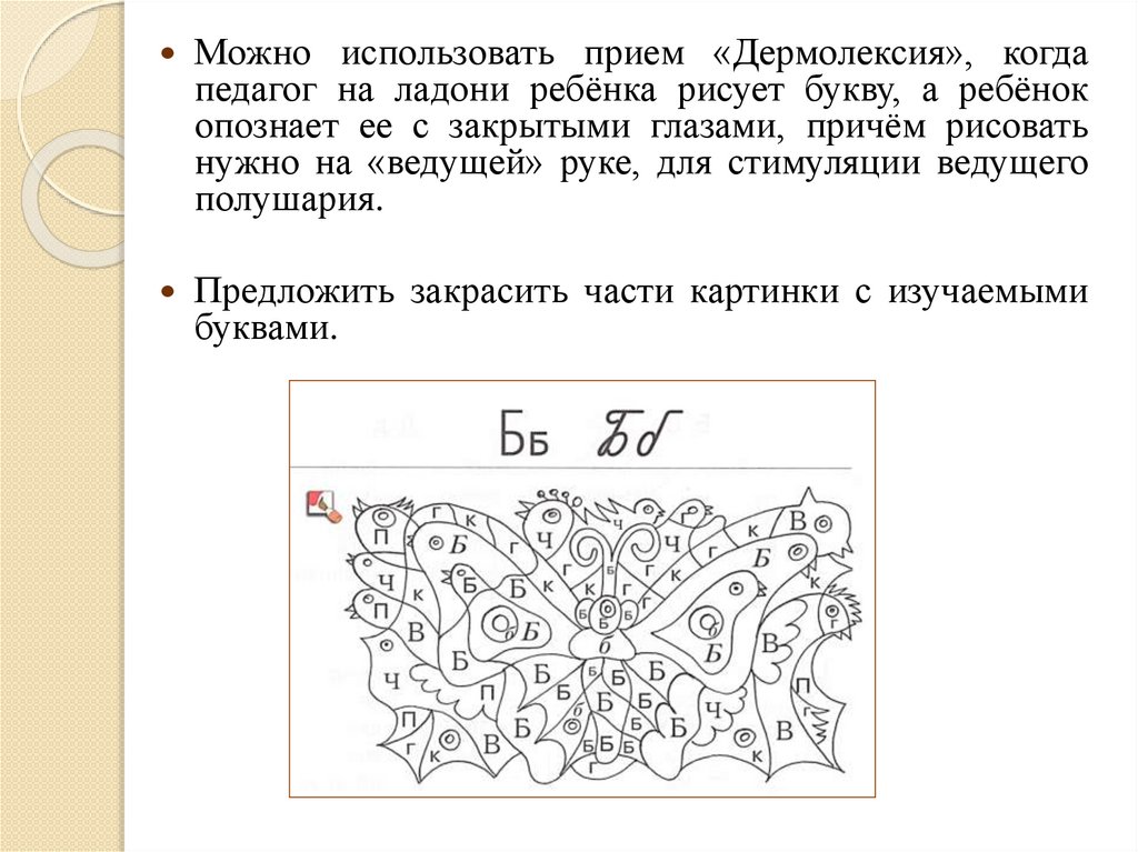 Можно использовать прием «Дермолексия», когдапедагог на ладони ребёнка рисует букву, а ребёнок