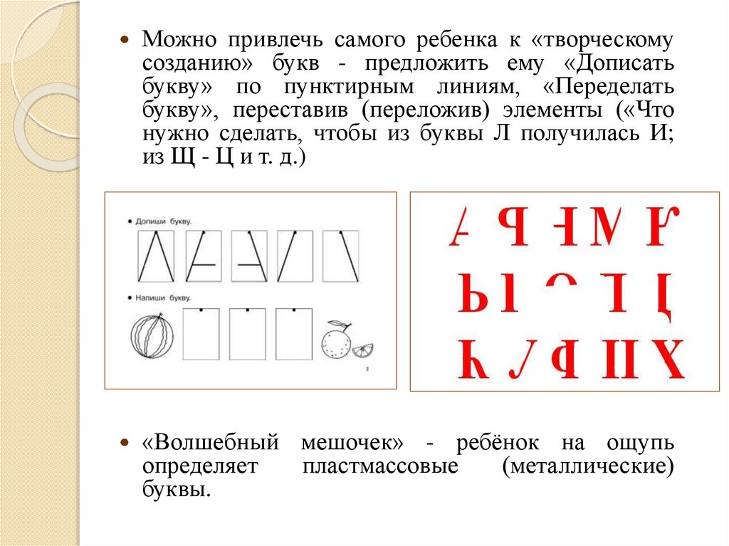 Можно привлечь самого ребенка к «творческомусозданию» букв - предложить ему «Дописать