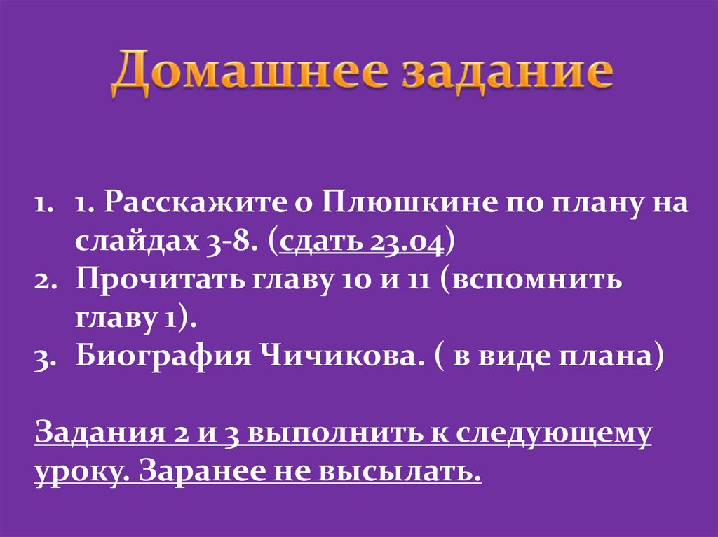 1. 1. Расскажите о Плюшкине по плану наслайдах 3-8. (сдать 23.04)