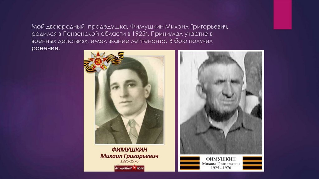 Мой двоюродный прадедушка, Фимушкин Михаил Григорьевич,родился в Пензенской области в 1925г. Принимал участие в