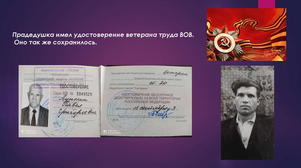 Прадедушка имел удостоверение ветерана труда ВОВ.Оно так же сохранилось.