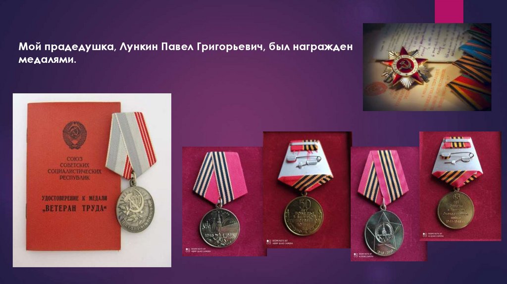 Мой прадедушка, Лункин Павел Григорьевич, был награжденмедалями.