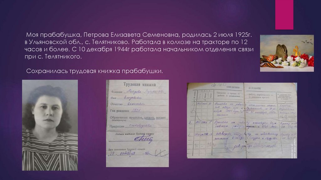 Моя прабабушка, Петрова Елизавета Семеновна, родилась 2 июля 1925г.в Ульяновской обл., с. Телятниково. Работала в колхозе на тракторе по 12