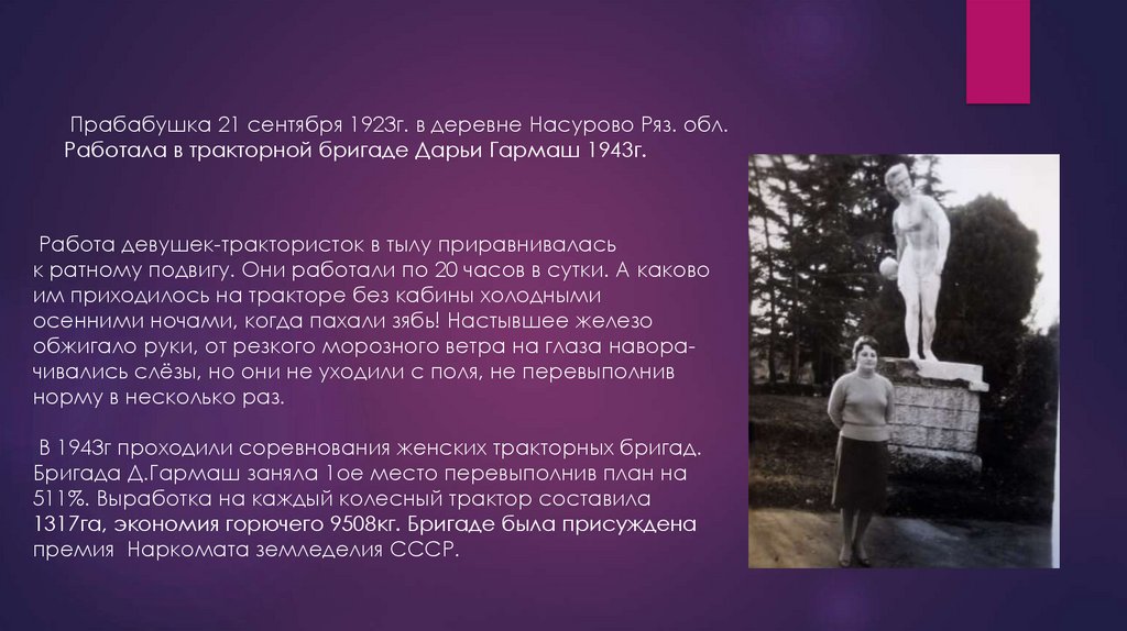 Прабабушка 21 сентября 1923г. в деревне Насурово Ряз. обл.Работала в тракторной бригаде Дарьи Гармаш 1943г.