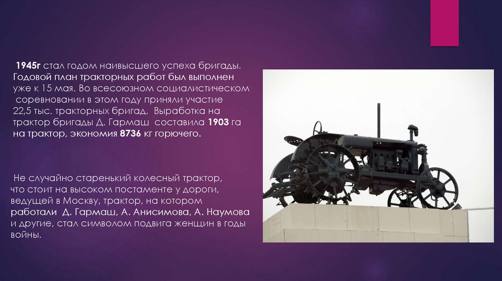 1945г стал годом наивысшего успеха бригады.Годовой план тракторных работ был выполнен