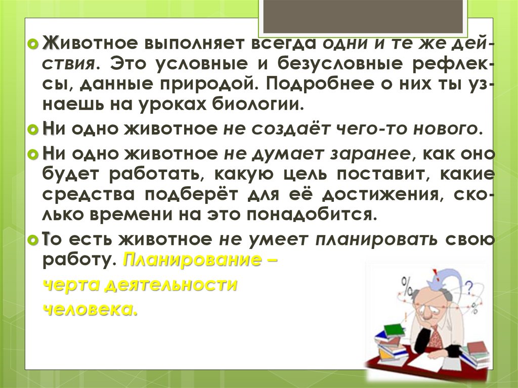 Животноевыполняет всегда одни и те же действия. Это условные и безусловные рефлексы, данные природой. Подробнее о них ты узнаешь на уроках биологии.