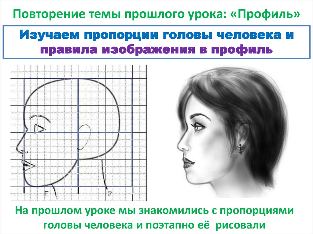 Повторение темы прошлого урока: «Профиль»Изучаем пропорции головы человека и