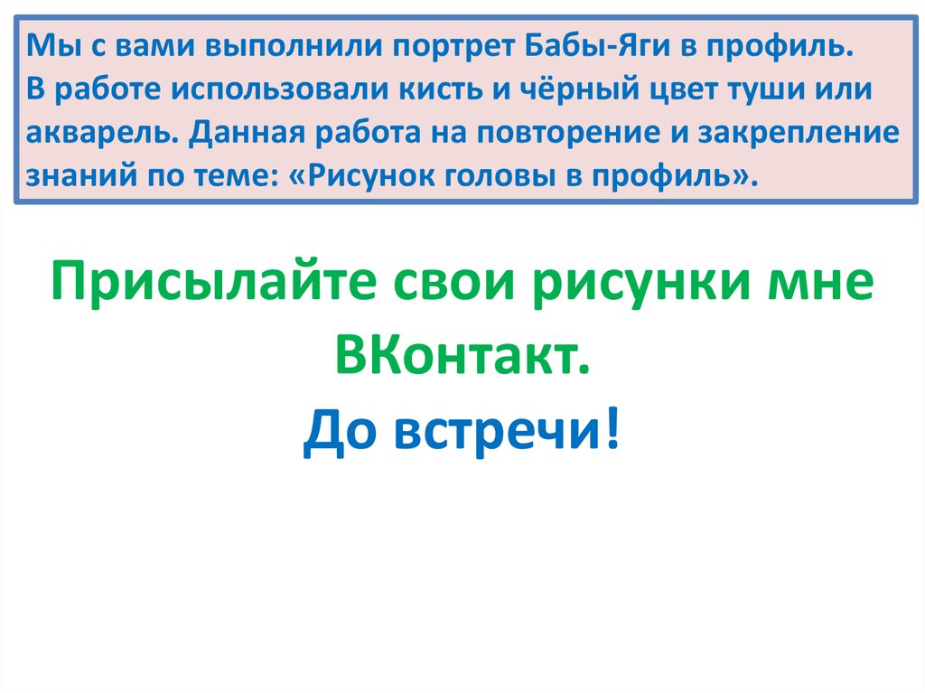 Мы с вами выполнили портрет Бабы-Яги в профиль.В работе использовали кисть и чёрный цвет туши или