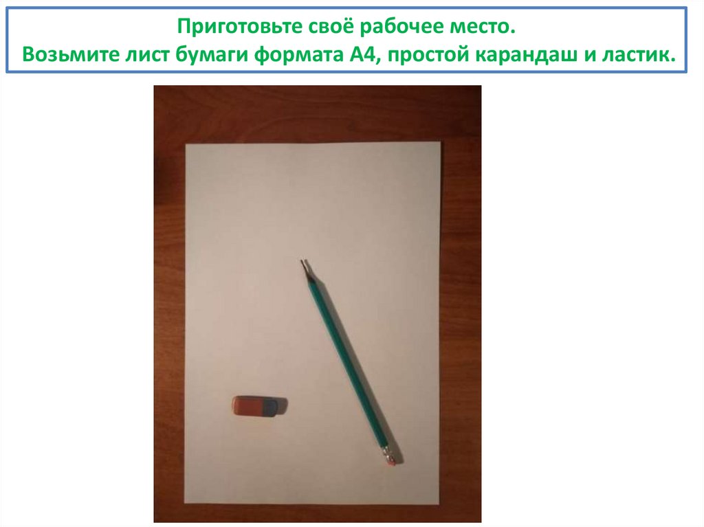 Приготовьте своё рабочее место.Возьмите лист бумаги формата А4, простой карандаш и ластик.
