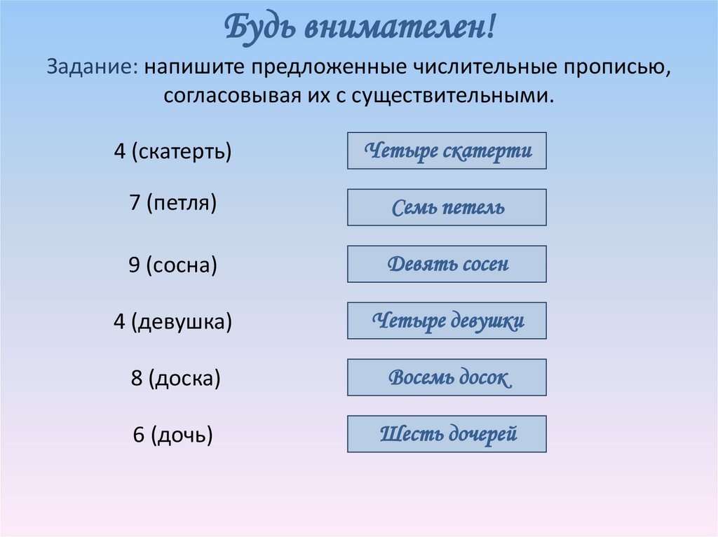Будь внимателен!Задание: напишите предложенные числительные прописью,