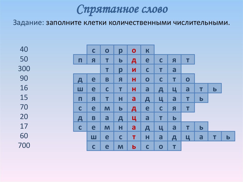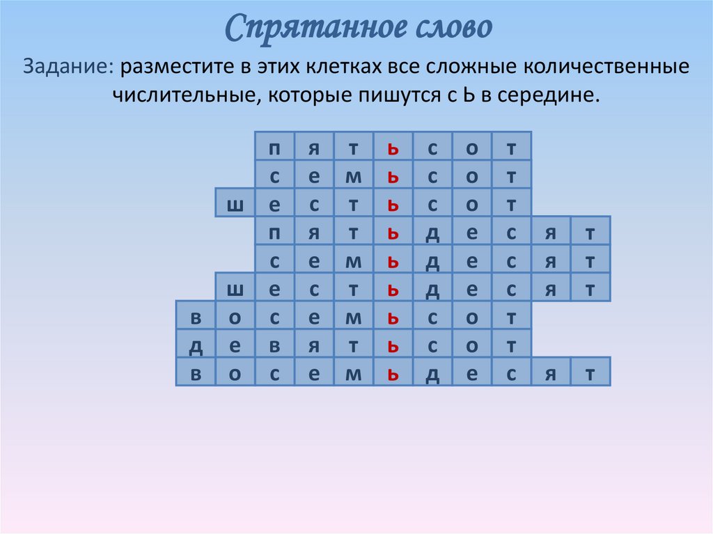 Спрятанное словоЗадание: разместите в этих клетках все сложные количественные