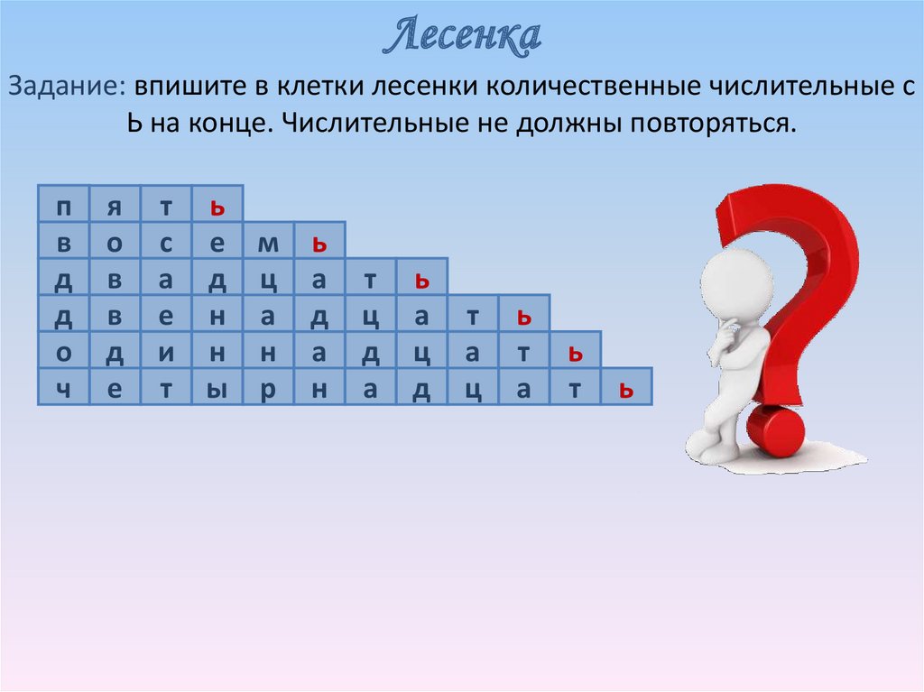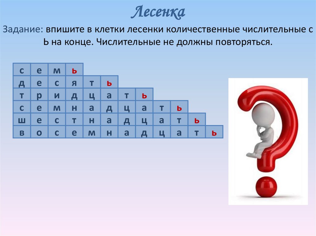 ЛесенкаЗадание: впишите в клетки лесенки количественные числительные с