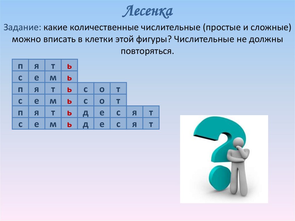 ЛесенкаЗадание: какие количественные числительные (простые и сложные)