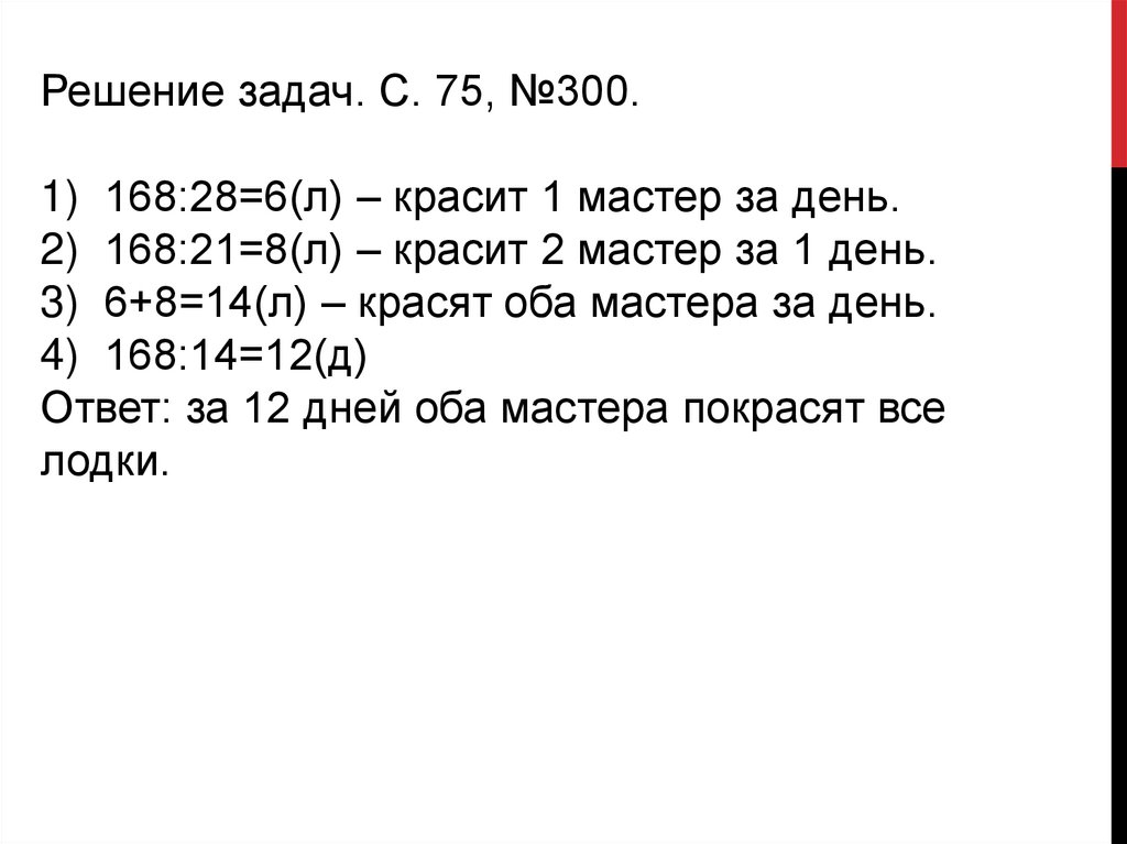 Решение задач. С. 75, №300.1) 168:28=6(л) – красит 1 мастер за день.