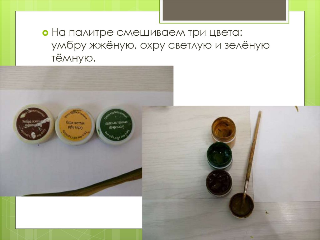 умбру жжёную, охру светлую и зелёную