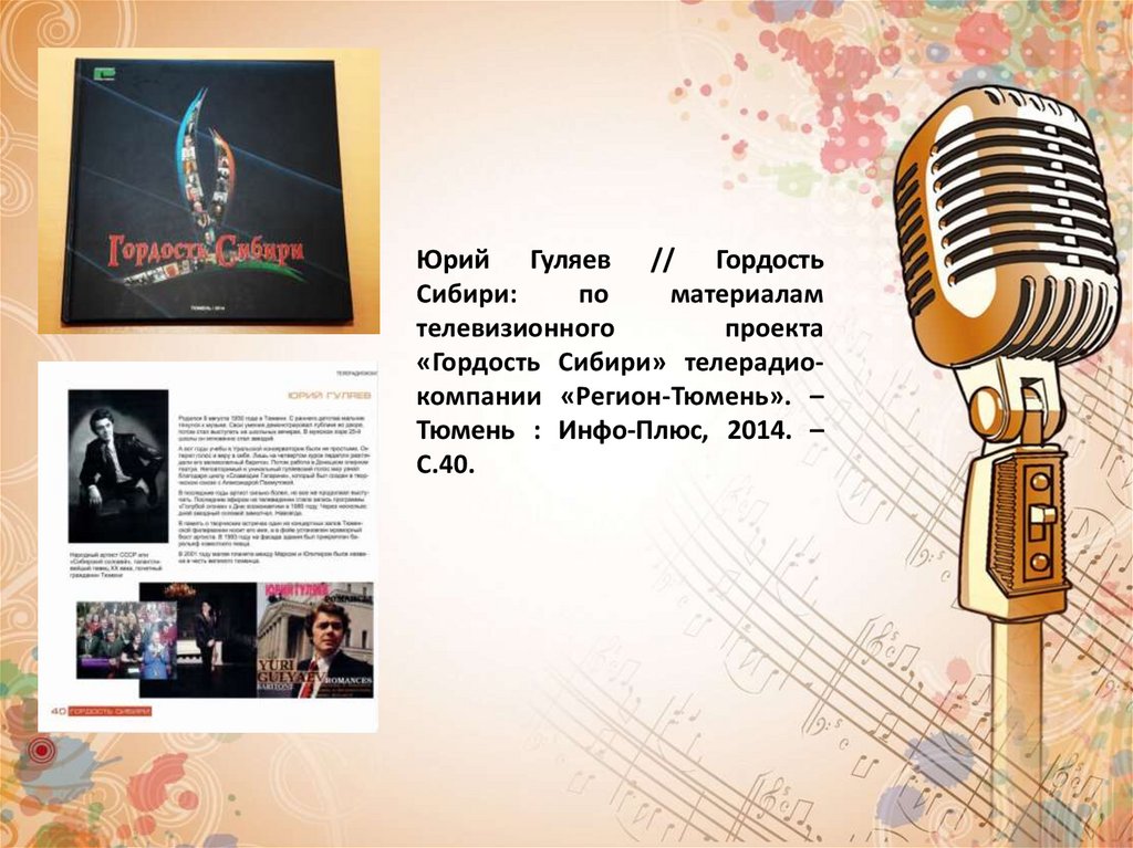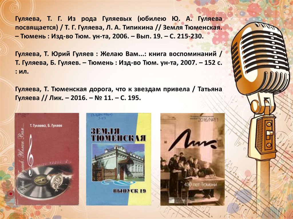 Гуляева, Т. Г. Из рода Гуляевых (юбилею Ю. А. Гуляевапосвящается) / Т. Г. Гуляева, Л. А. Типикина // Земля Тюменская.