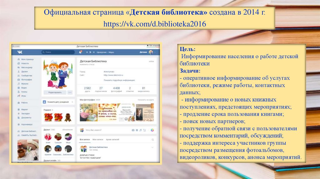 Официальная страница «Детская библиотека» создана в 2014 г.https://vk.com/d.biblioteka2016