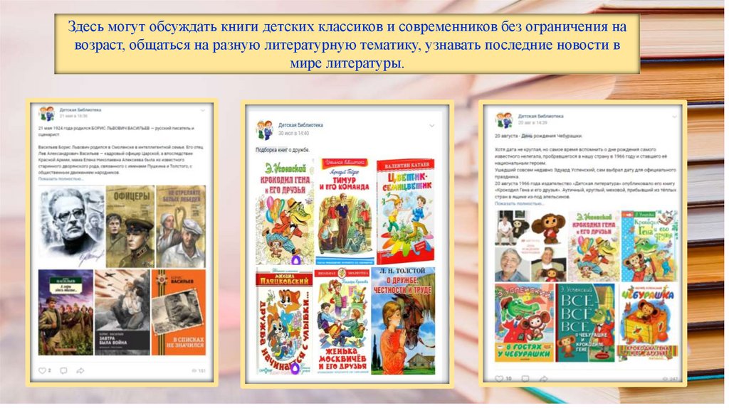 Здесь могут обсуждать книги детских классиков и современников без ограничения навозраст, общаться на разную литературную тематику, узнавать последние новости в