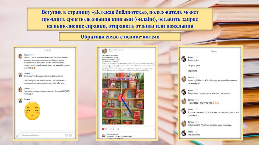 Вступив в страницу «Детская библиотека», пользователь можетпродлить срок пользования книгами (онлайн), оставить запрос