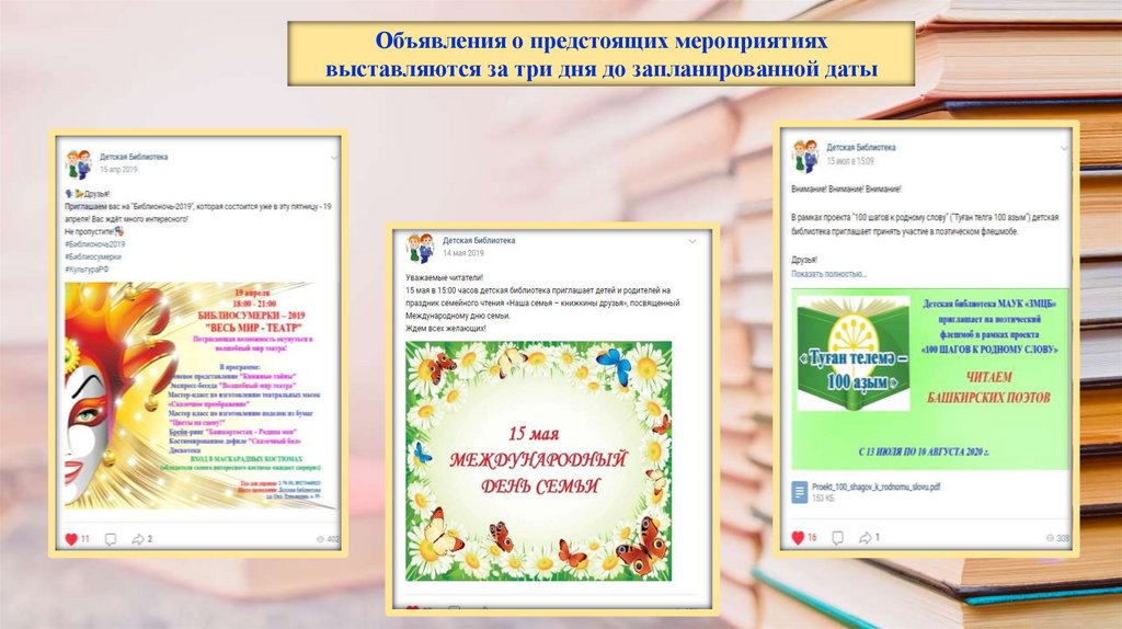Объявления о предстоящих мероприятияхвыставляются за три дня до запланированной даты