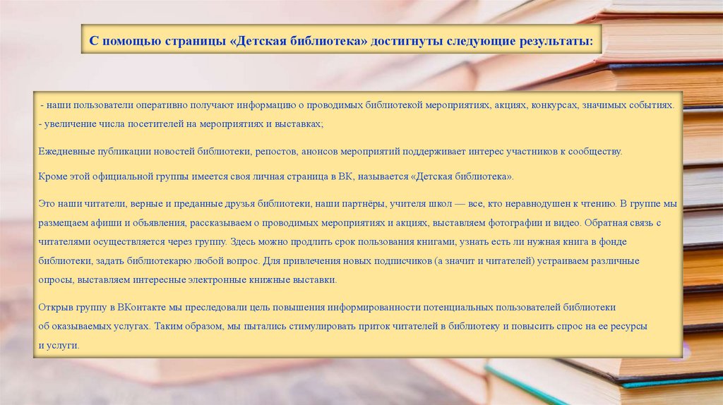 С помощью страницы «Детская библиотека» достигнуты следующие результаты:- наши пользователи оперативно получают информацию о проводимых библиотекой мероприятиях, акциях, конкурсах, значимых событиях.
