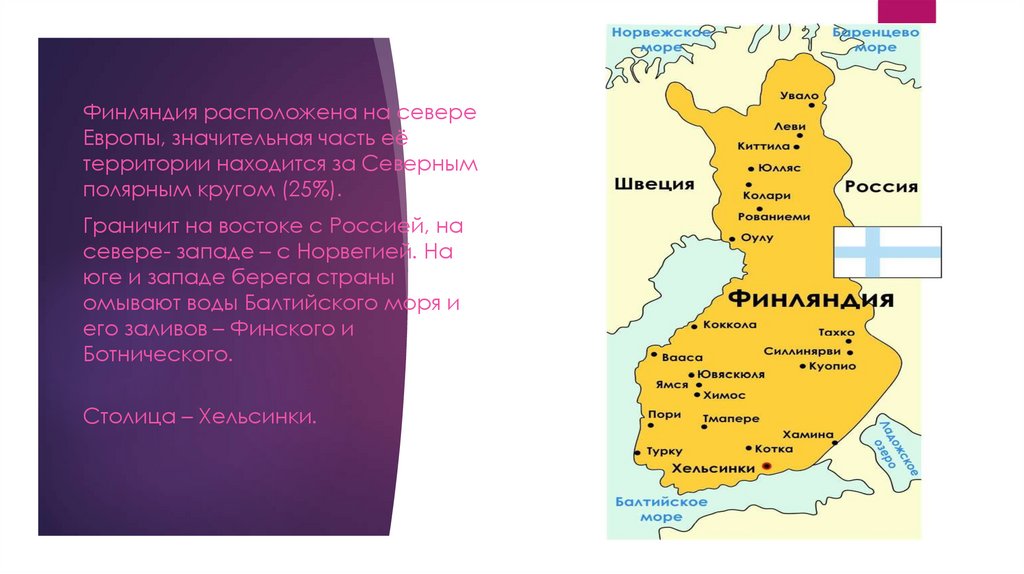 2. Финляндия-государство на севере Европы в восточной части Скандинавского полуострова.