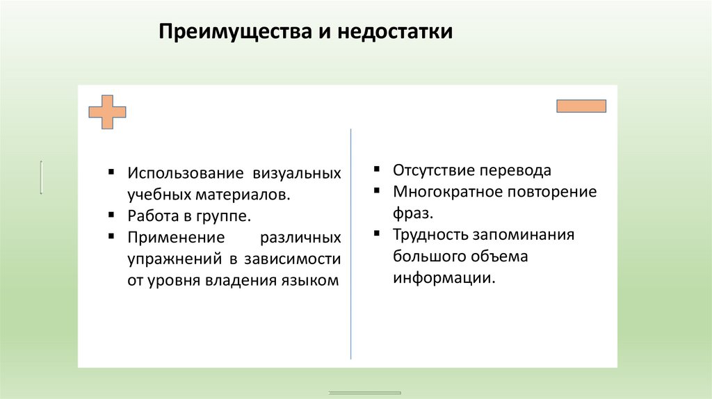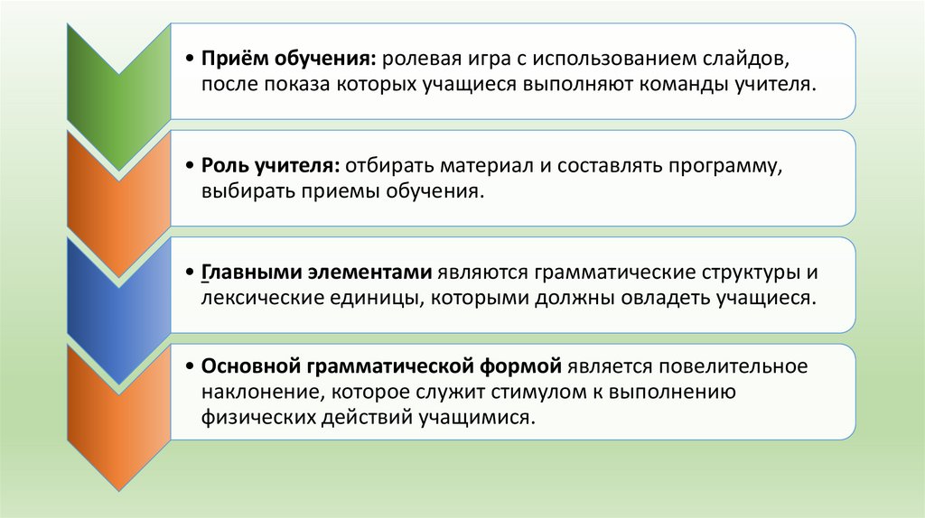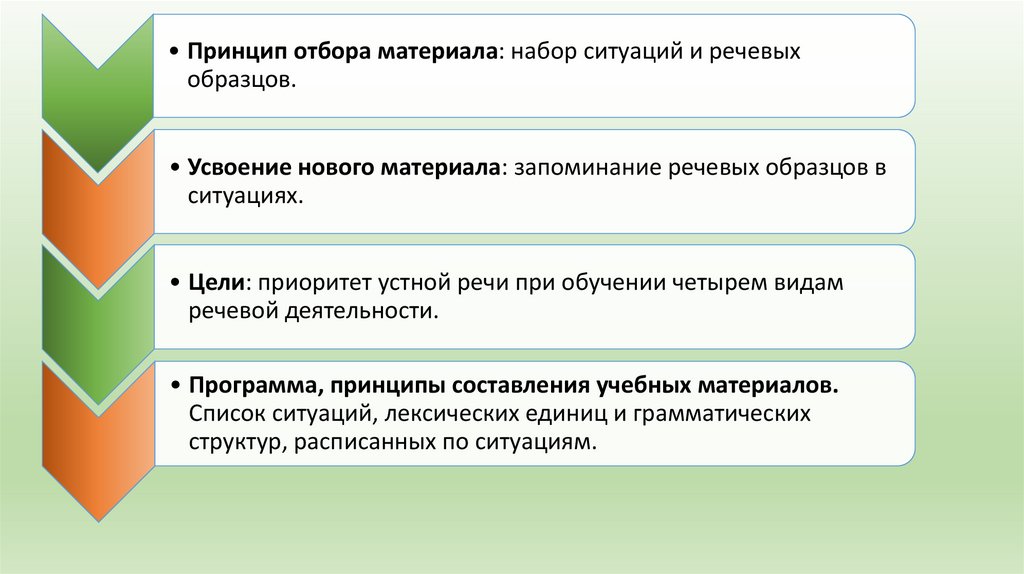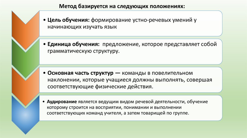 Метод базируется на следующих положениях:• Цель обучения: формирование устно-речевых умений у