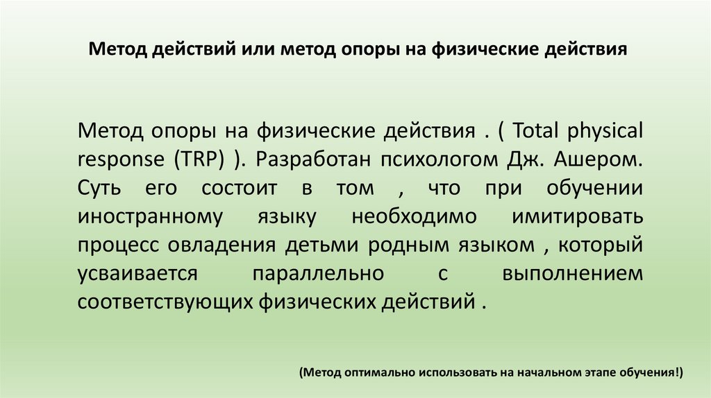 Метод действий или метод опоры на физические действияМетод опоры на физические действия . ( Total physical