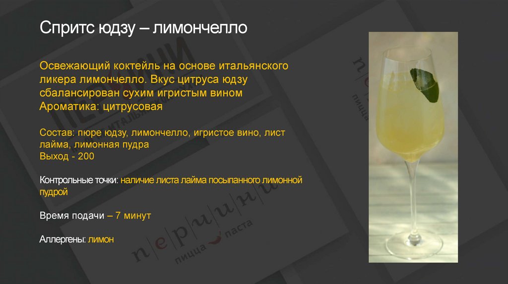 Состав: пюре юдзу, лимончелло, игристое вино, лист
