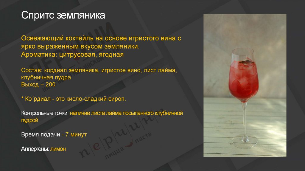 Состав: кордиал земляника, игристое вино, лист лайма,