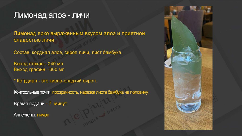 Состав: кордиал алоэ, сироп личи, лист бамбука.