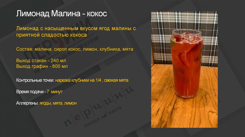 Состав: малина, сироп кокос, лимон, клубника, мята