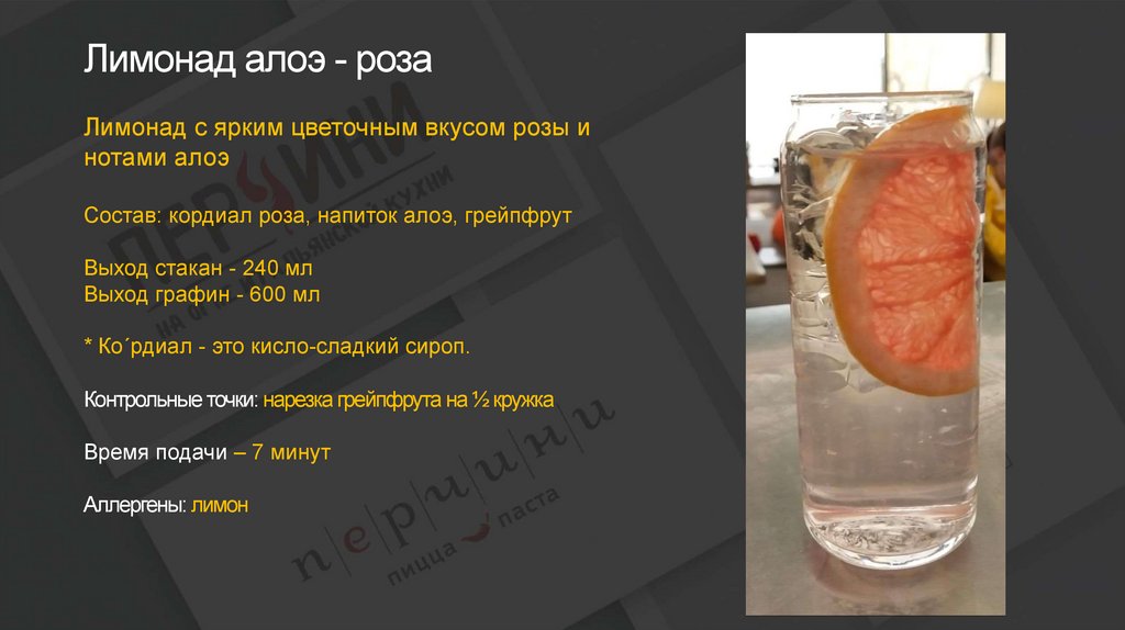 Состав: кордиал роза, напиток алоэ, грейпфрут