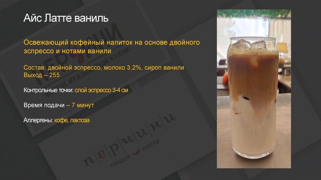 Состав: двойной эспрессо, молоко 3,2%, сироп ванили
