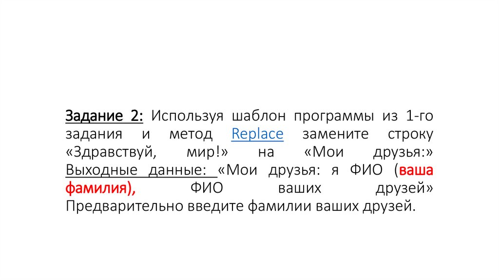 1. Задание 2: Используя шаблон программы из 1-го задания и метод Replace замените строку «Здравствуй, мир!» на «Мои друзья:»