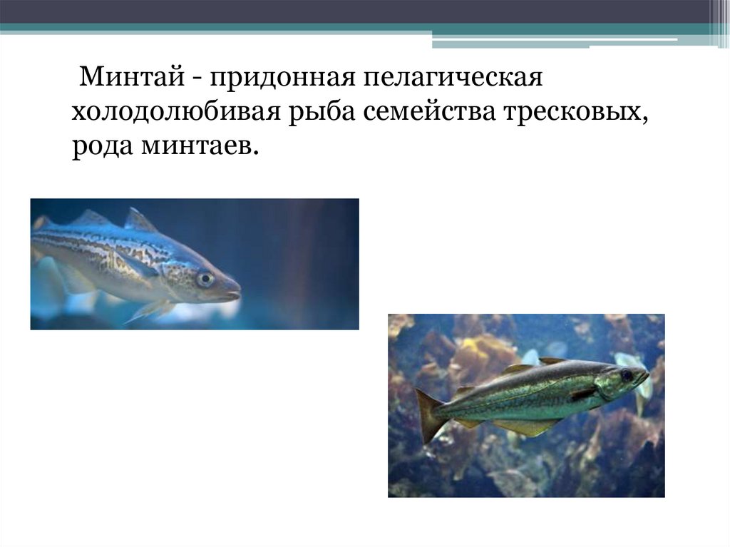 Минтай - придонная пелагическаяхолодолюбивая рыба семейства тресковых,