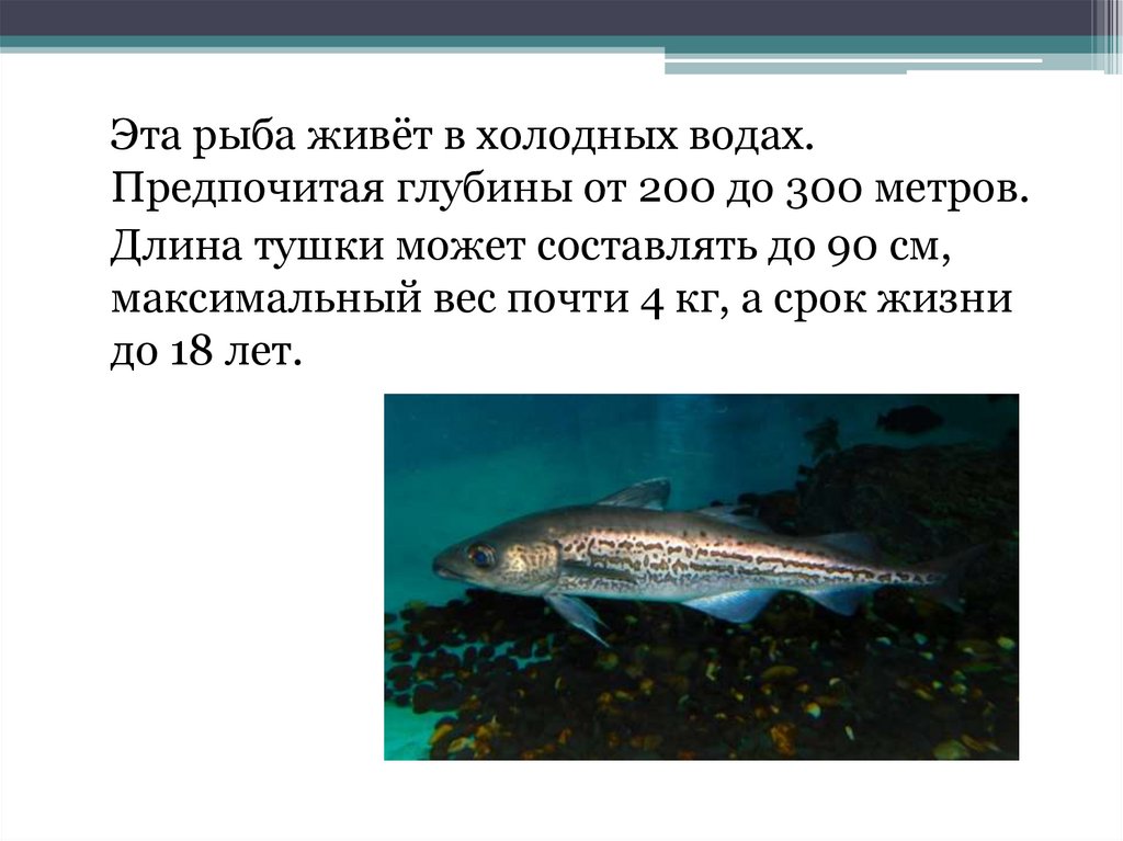 Эта рыба живёт в холодных водах.Предпочитая глубины от 200 до 300 метров.