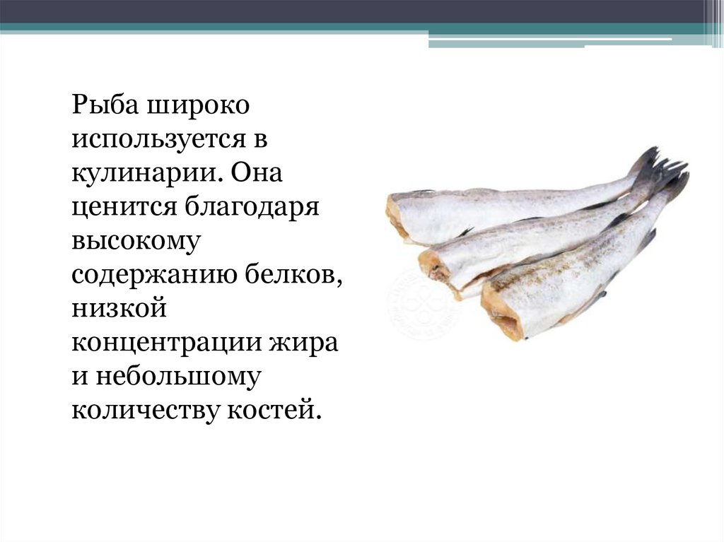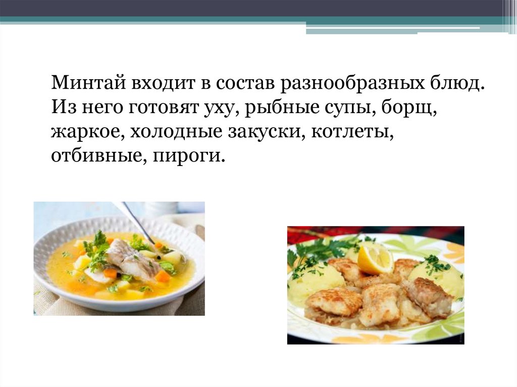 Минтай входит в состав разнообразных блюд.Из него готовят уху, рыбные супы, борщ,