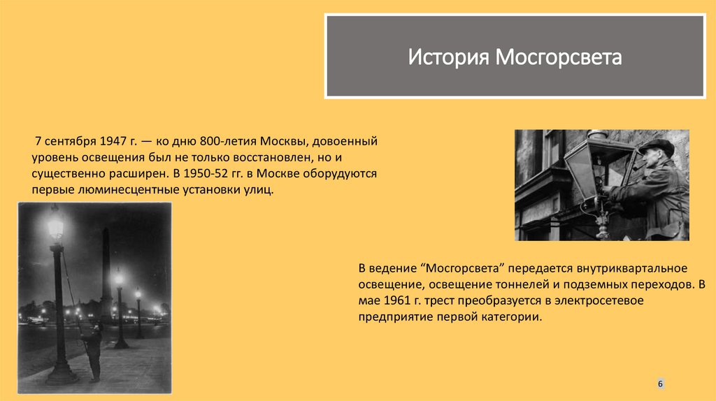 История Мосгорсвета7 сентября 1947 г. — ко дню 800-летия Москвы, довоенный