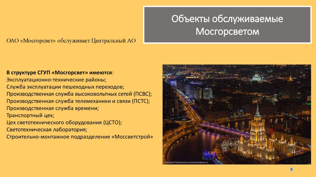 ОАО «Мосгорсвет» обслуживает Центральный АООбъекты обслуживаемые