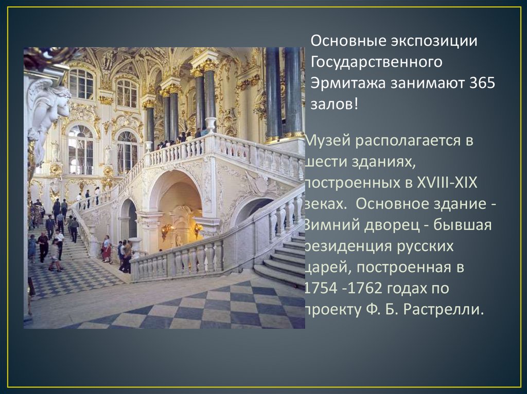 3. Эрмитаж - один из крупнейших художественных музеев мира. Расположен в самом центре Петербурга – напротив Петропавловской